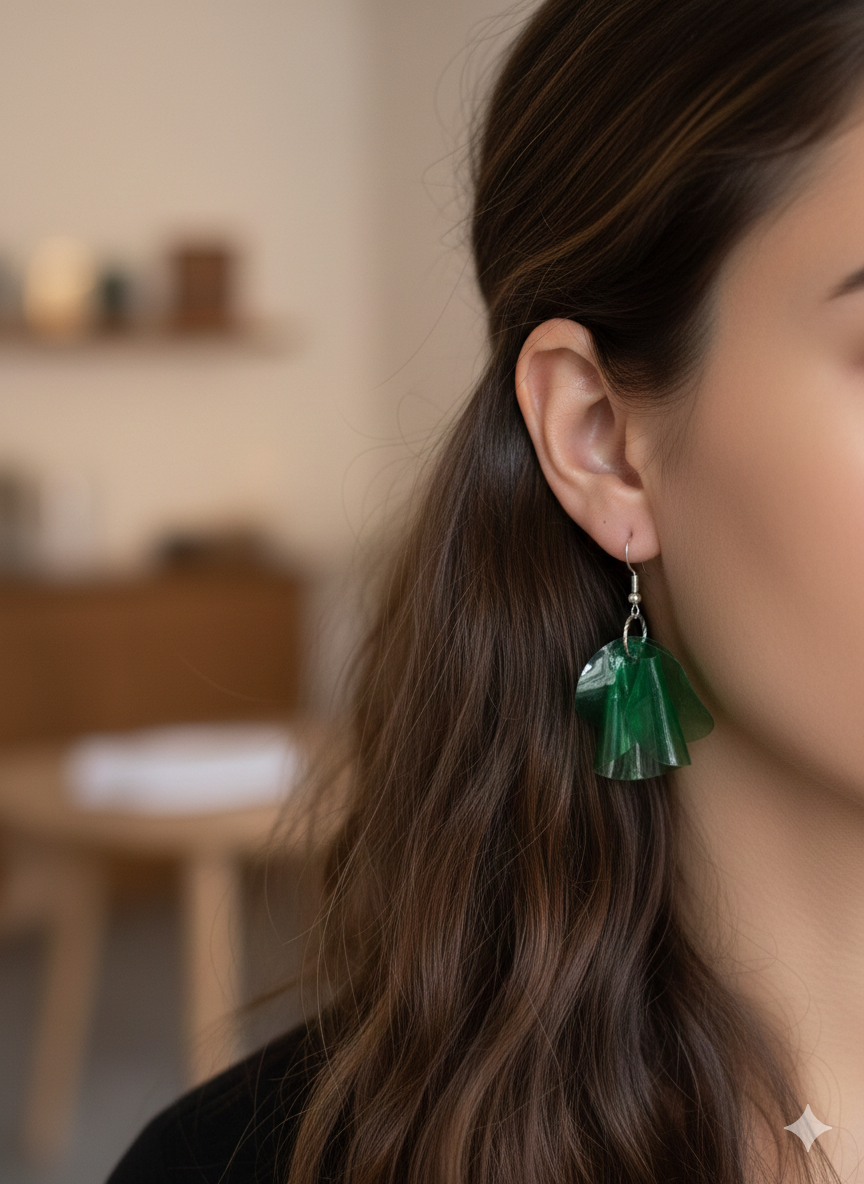Who knew a humble water bottle could look this good? These vivid green petal earrings are handcrafted from recycled sparkling water bottles, transformed into glossy, light-catching statement pieces that prove sustainability can shine.
