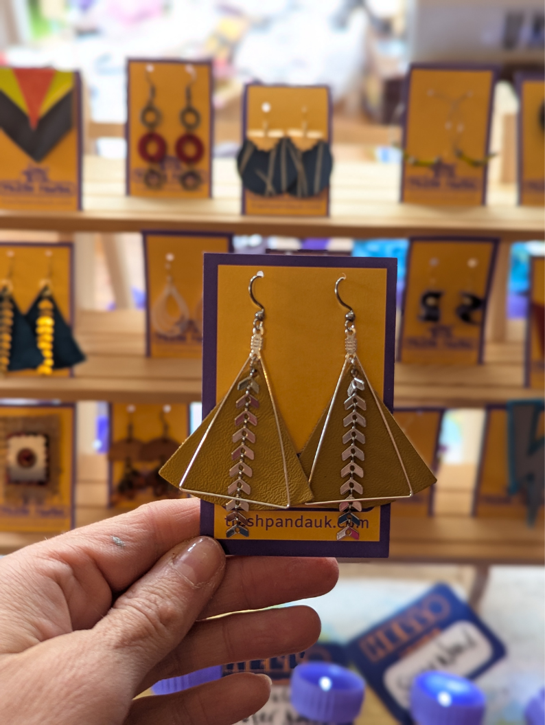 Each pair is cut by hand from genuine leather offcuts, rescued from the sofa industry and given a new life as statement-making jewellery. The triangle frames and chevron links add movement and shine, catching the light with every turn of your head.