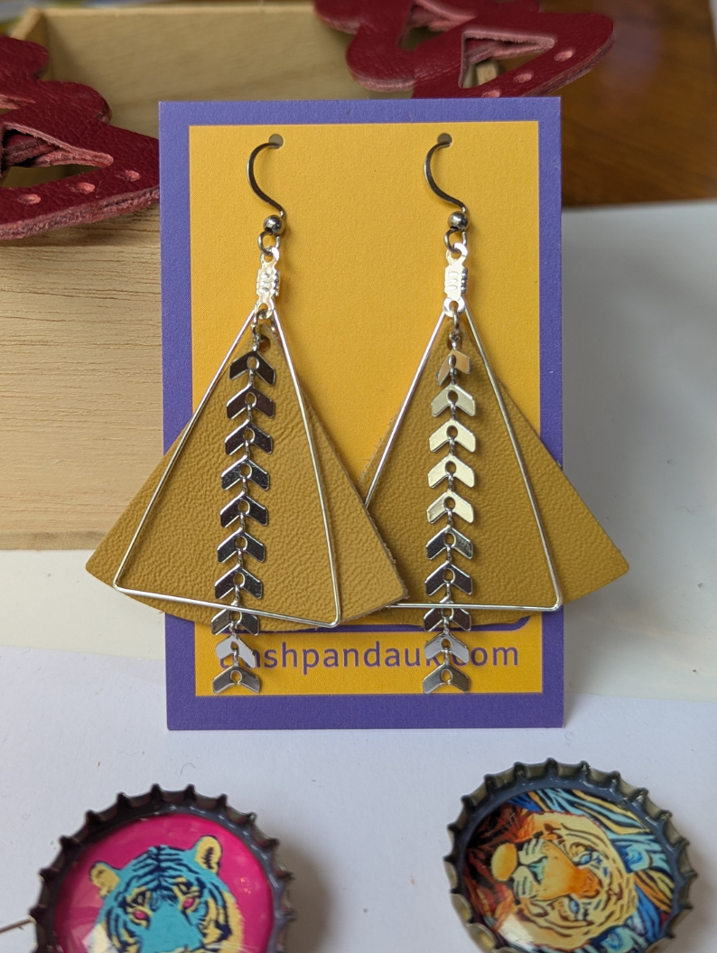 These earrings mix rich mustard leather triangles with a sleek stainless-steel chevron chain and triangle — geometric, playful, and unapologetically bold.