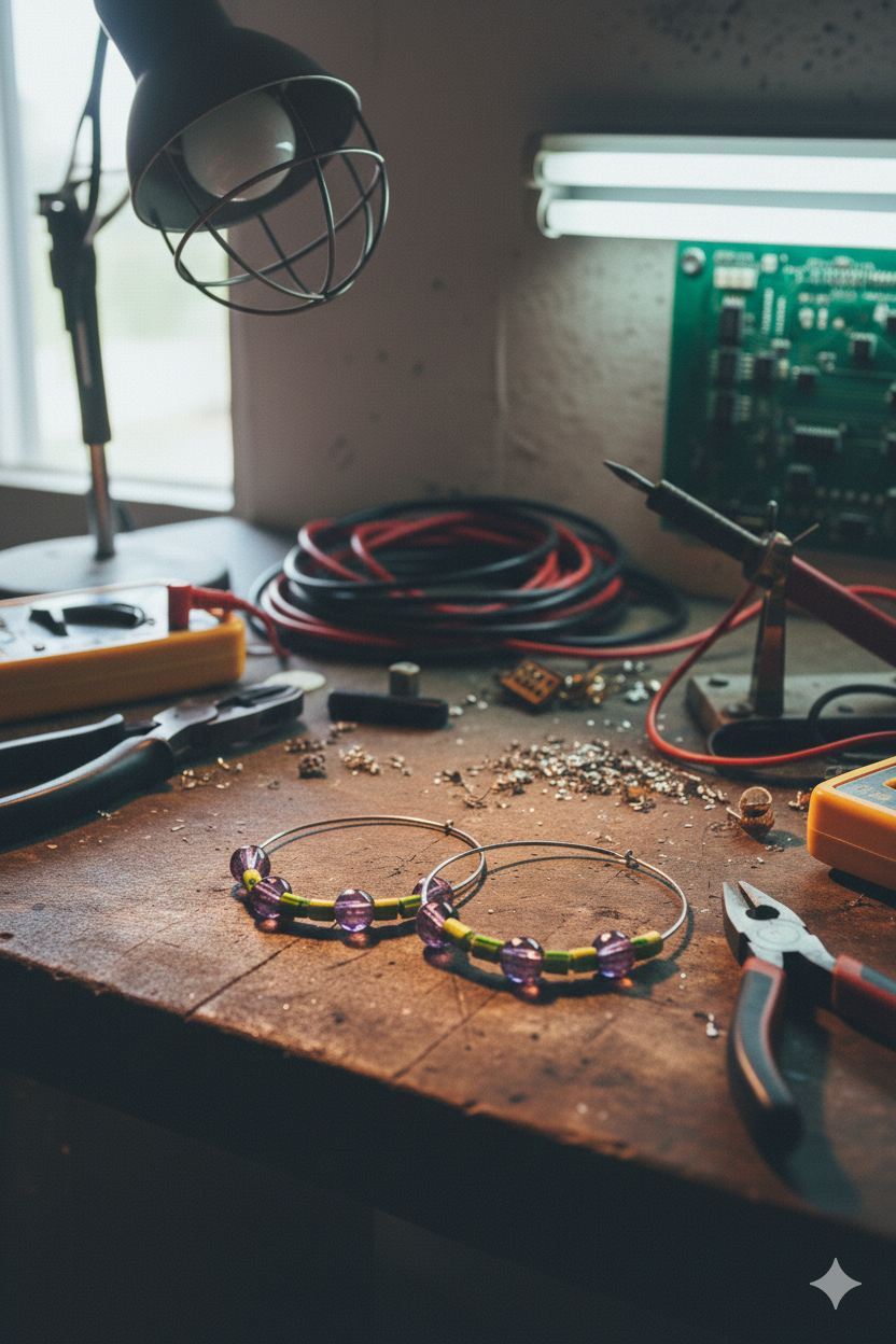• Upcycled Materials: Electrical-wire offcuts transformed into colourful beads, paired with purple beads rescued from a broken necklace.