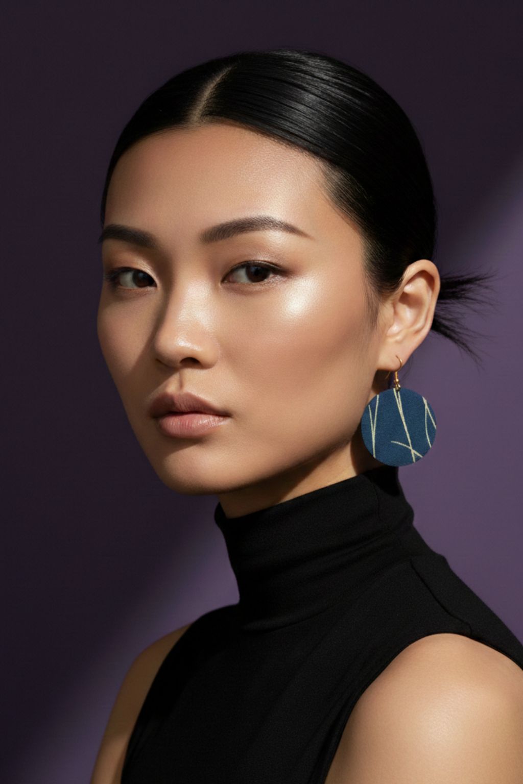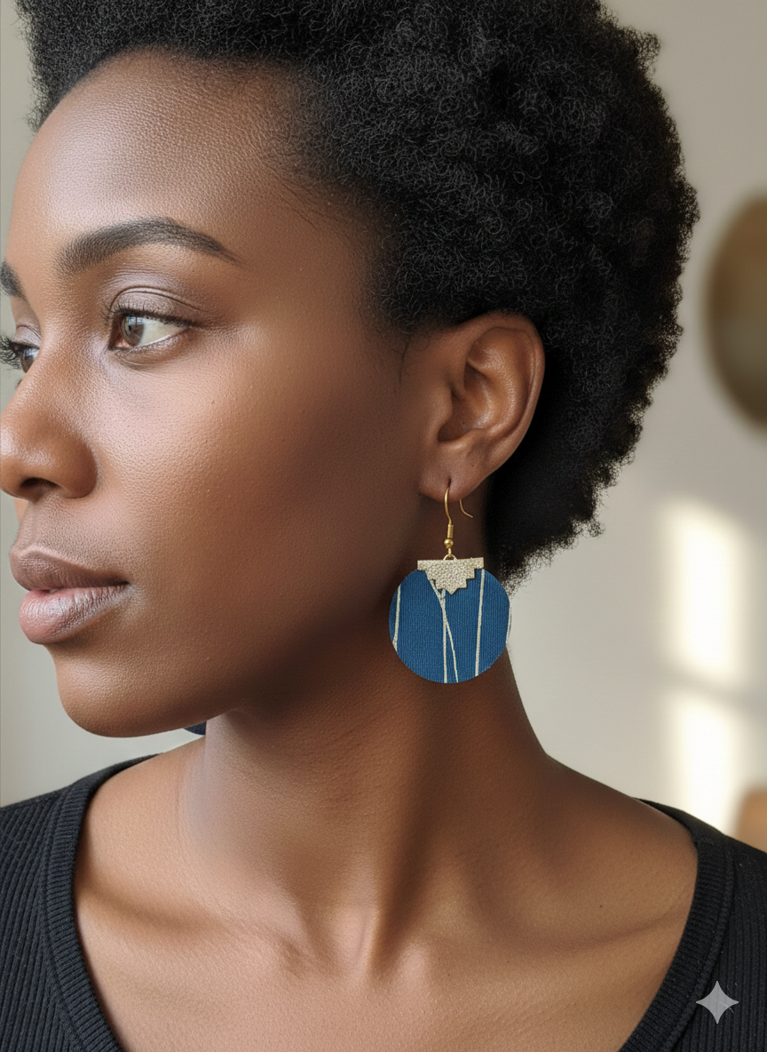 These Midnight Deco earrings are handcrafted from repurposed blind material sample booklets, giving old design swatches a dazzling new life as wearable art. Each pair features bold navy circles with gold geometric accents